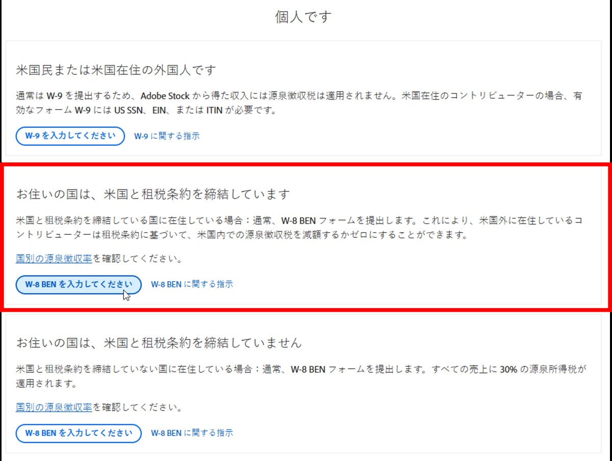 W-9は米国居住者用であり、日本居住者は選んではいけないこと、条約未締結国を選ぶと源泉徴収が発生するため、適切でないことも教えてもらいました。