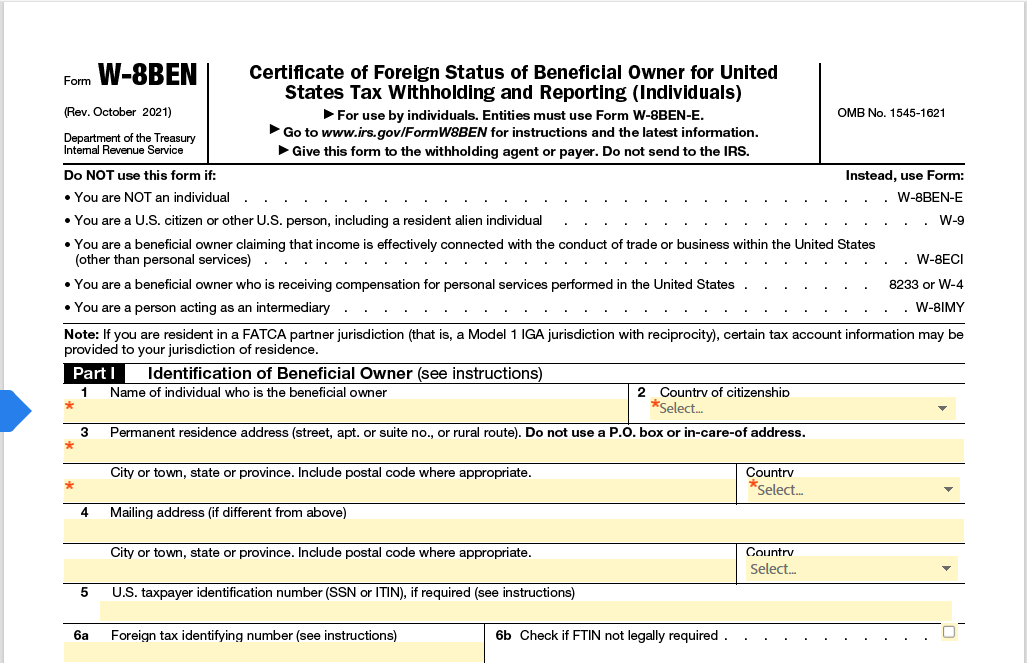 税務審査でW-8BENを選択した後、次の入力内容が表示されます。