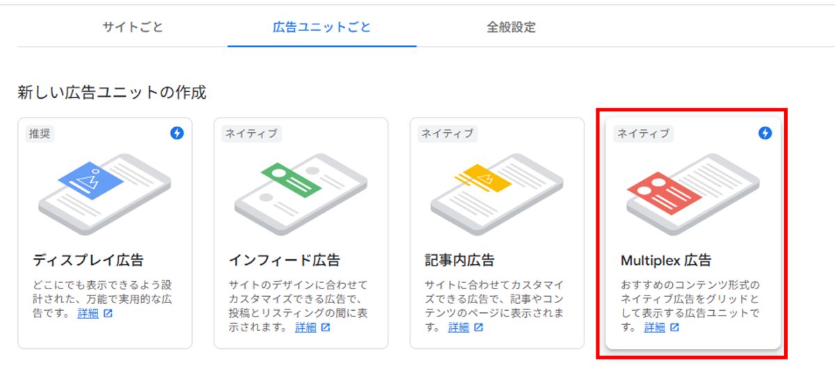 Googleアドセンスのサイトに開き、広告ユニットでマルチプレックス広告をクリックします。