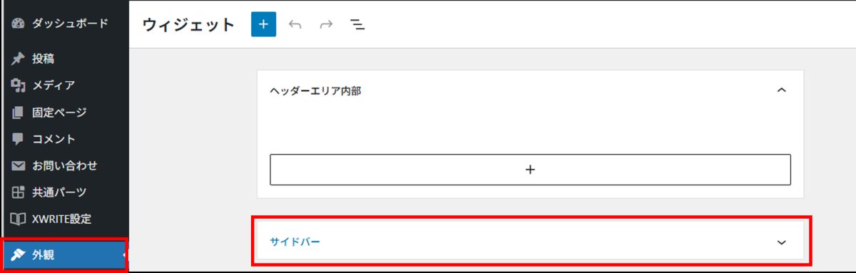WordPress管理画面 → 「外観」→「ウィジェット」を開いて「サイドバー」エリアを選択します。