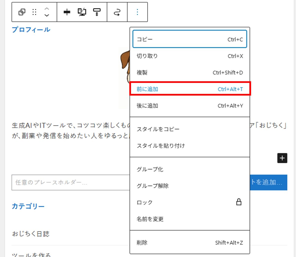 サイドメニューの先頭に広告を設置するため、サイドメニューの先頭を選択して「前に追加」をクリックします。