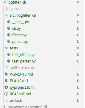 uv init logfilter-cli --python 3.13logfilter-cli配下にmain.pyが作成されますが、不要なため、削除しておきます。