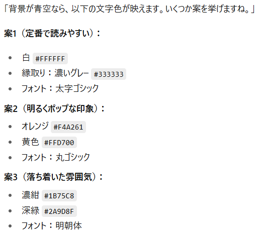 ChatGPTは「白文字+グレーの縁取り」や「明るい黄色+半透明帯」など、例えば次のように複数の候補を提示してくれます。