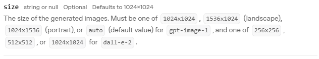 ChatGPTの画像生成APIを利用した場合、次のAPIドキュメントに掲載されているように1024×1024・1024×1536・1536×1024 の出力サイズを指定できます。