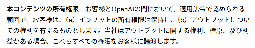 ChatGPTで生成した画像を含めたコンテンツの権利を書いているのは次の画像です。