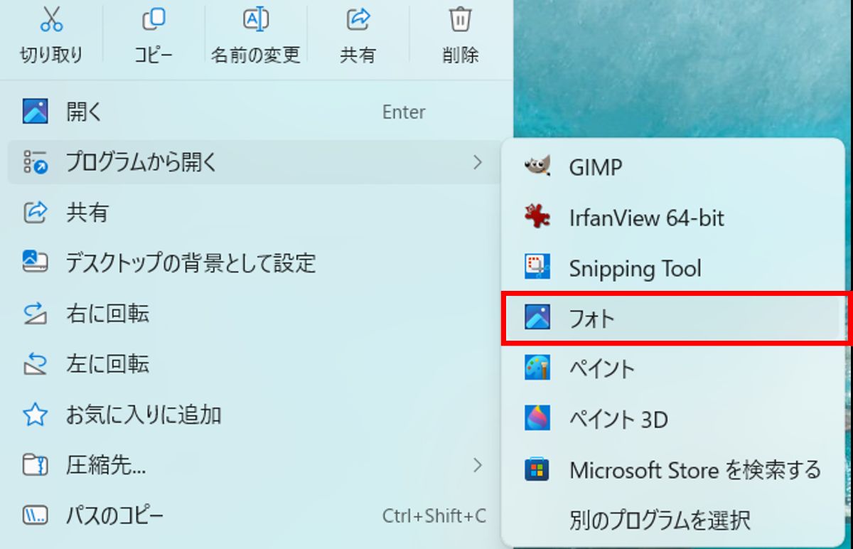 フォルダ内の画像を右クリックして「プログラムから開く」→「フォト」を選びます。
