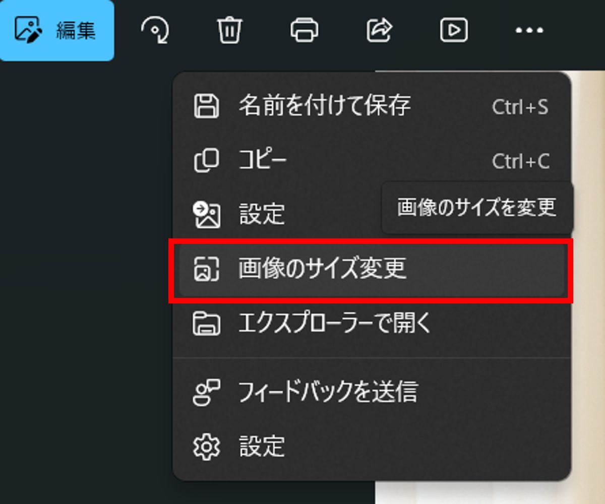 リサイズをした画像をフォトで開いて次のように編集を選択します。