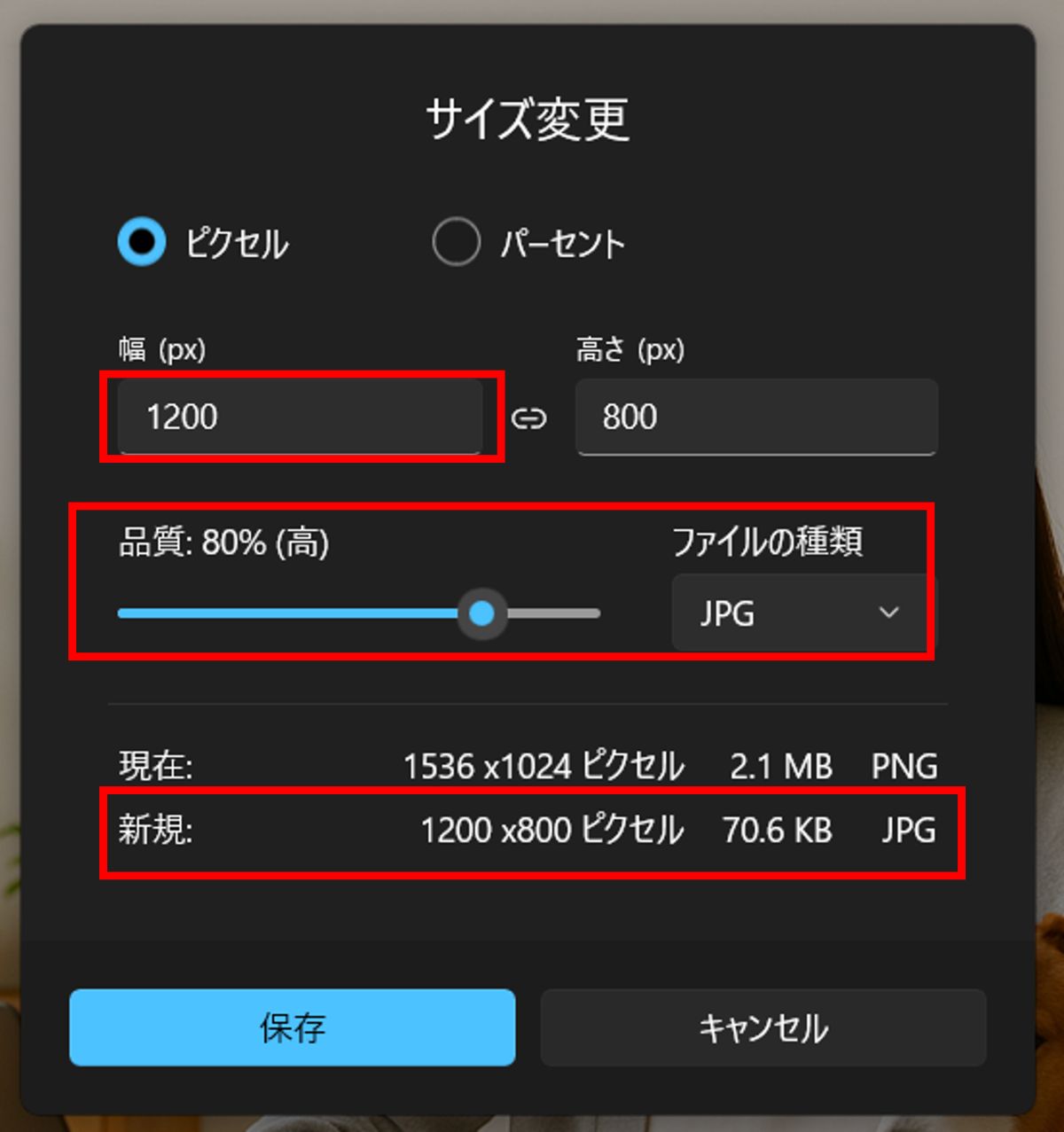 画像サイズが大きいとブログの表示に時間がかかるため、見た目が変わらない形式、サイズに変更することが重要です。