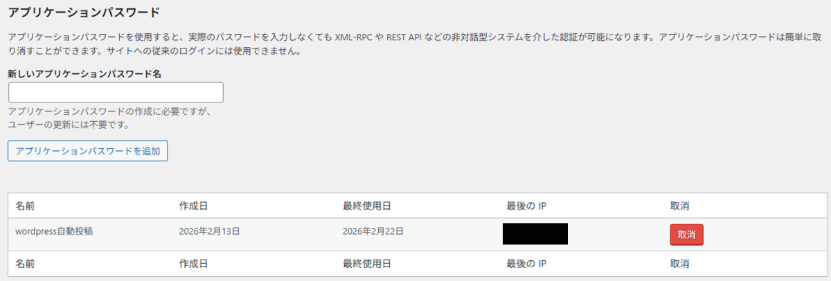 自動投稿を行うために、WordPressでアプリケーションパスワードの設定が必要です。