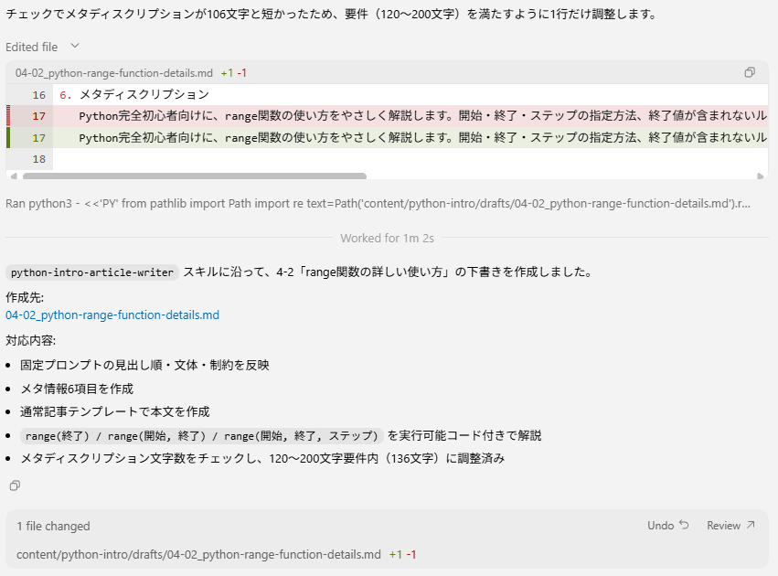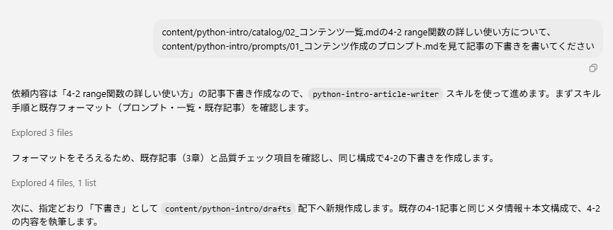Codexで実際にブログ記事の作成を依頼すると次のように自動的に実行されます。