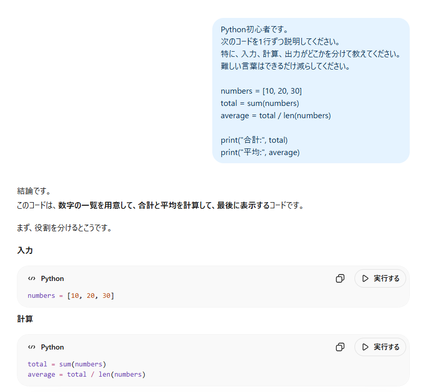 ChatGPTは、AIが書いたコードを「やさしく説明してもらう相手」として使いやすいです。