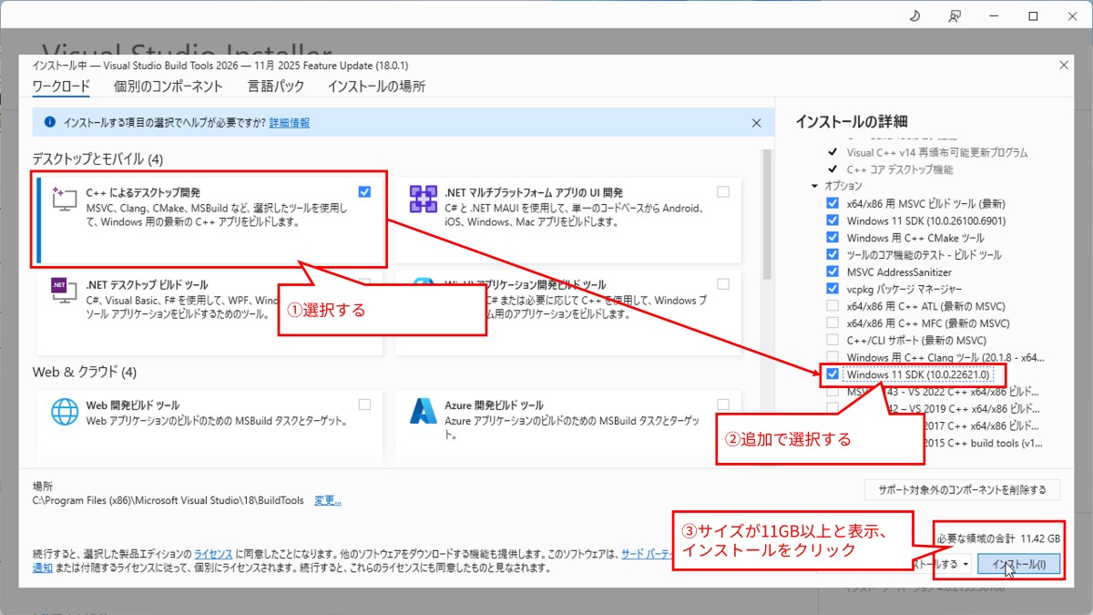 ダウンロードインストーラを起動し、次のようにインストールオプションで「C++ によるデスクトップ開発」を選択、追加で「Windows 11 SDK」を選択してインストールします。