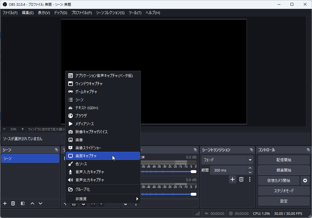 ソースの追加を選択して画面キャプチャを選択する