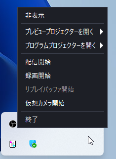 録画を終了する場合、同じようにタスクトレイ内のOBSを右クリックして「録画終了」を選択します。