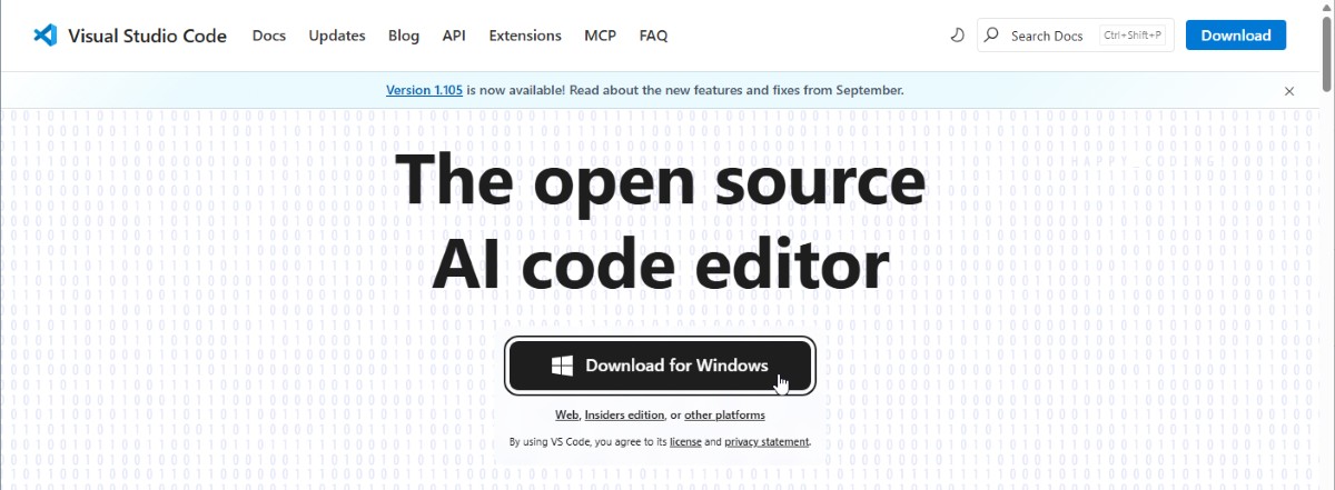 VSCode公式サイトからインストーラをダウンロードします。