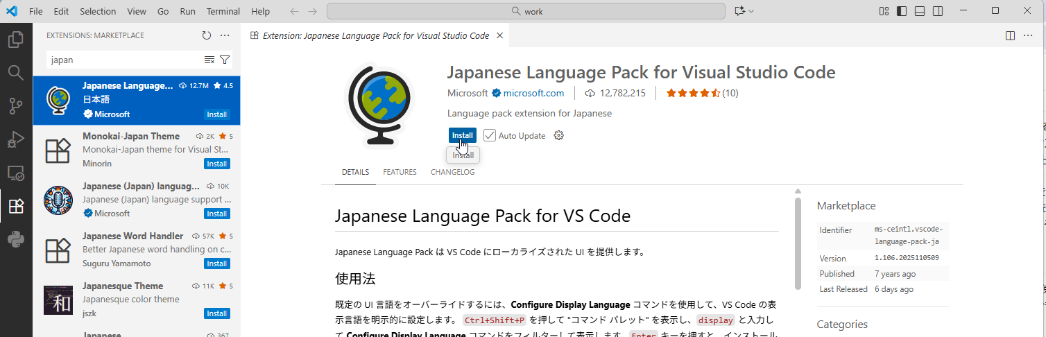 VSCodeの日本語化は、拡張機能で「Japanese Language Pack for Visual Studio Code」を検索してインストールします。