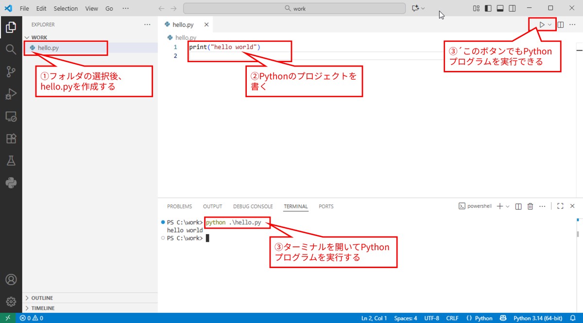 Pythonのコードを保存するフォルダを選択した後、次の①から③の手順を実行すると、Pythonプログラムが実行できます。