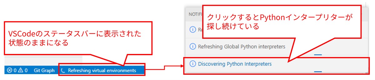 uvを導入してPythonを入れた後、VSCodeを起動すると次のように「Refreshing virtual enviroments」が表示されてPythonが認識されない状態になっていました。