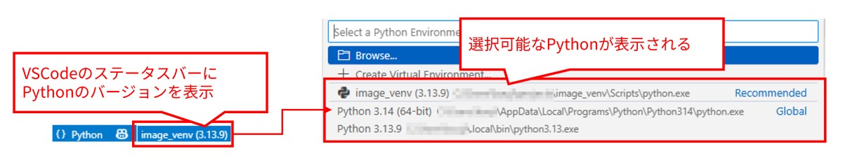 すると、次のように右下のステータスバーにPythonのバージョンが表示され、インタープリター候補にもuvで作った仮想環境が並び、すぐに選べるようになりました。