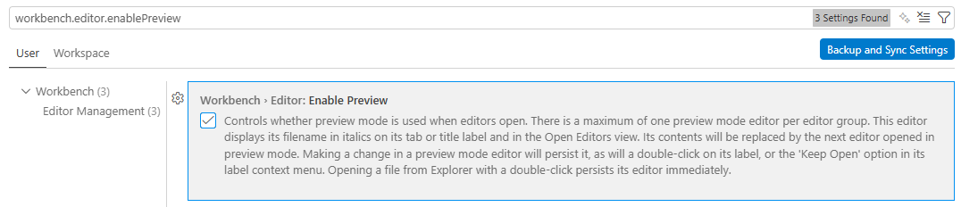 - workbench.editor.enablePreview を検索する