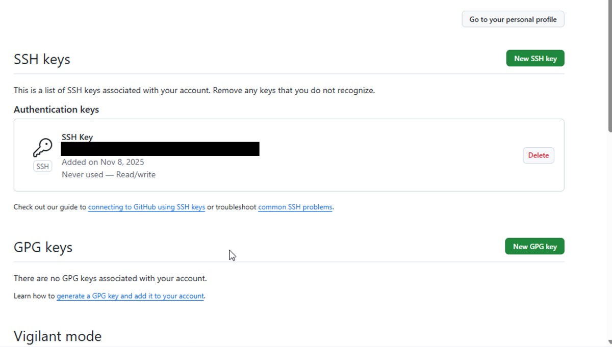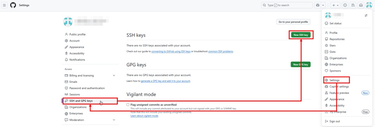 ssh-ed25519 xxxxxxxxxxxxxxxxxxxxxxxxxxxxxxxxxxxxxxxxxxx your_email@example.comコピー後、GitHubにログインし、右上のアイコンから「Settings」→「SSH and GPG keys」→「New SSH key」を選択します。